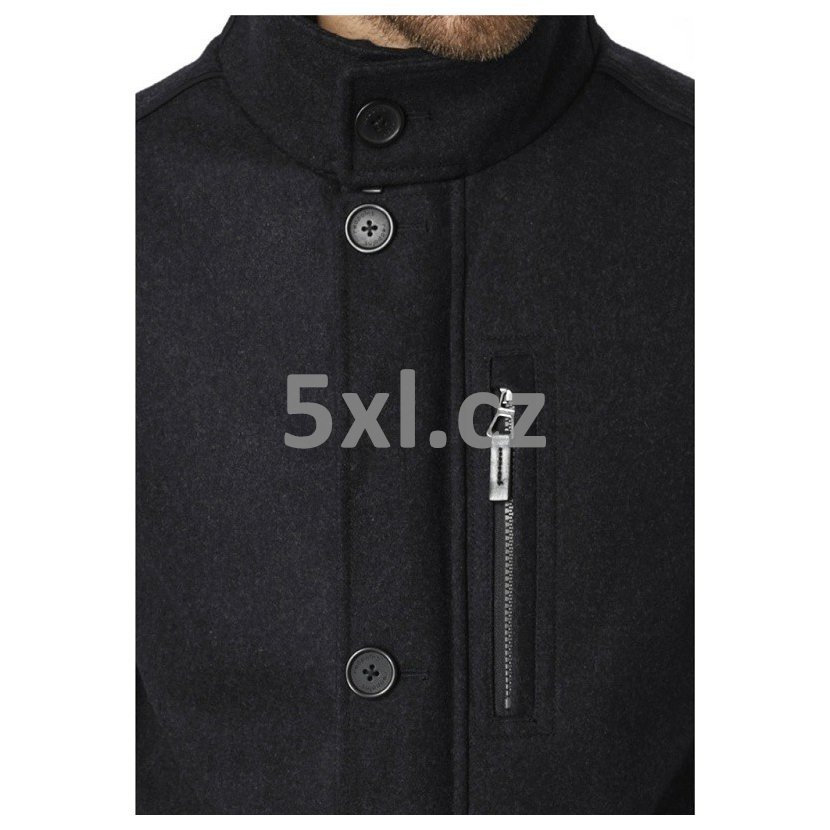 Pánská bunda vlněná 74314 černá střední délka kabátový střih - nadměrná velikost. Zapínání na zip s klopou na knoflíky. Levá a pravá kapsa. Levá svislá náprsní kapsa. Límec stojáček. Uvnitř podšívka, levá náprsní kapsa na zip, pravá na knoflík.