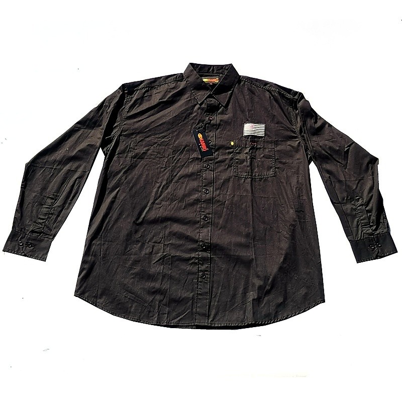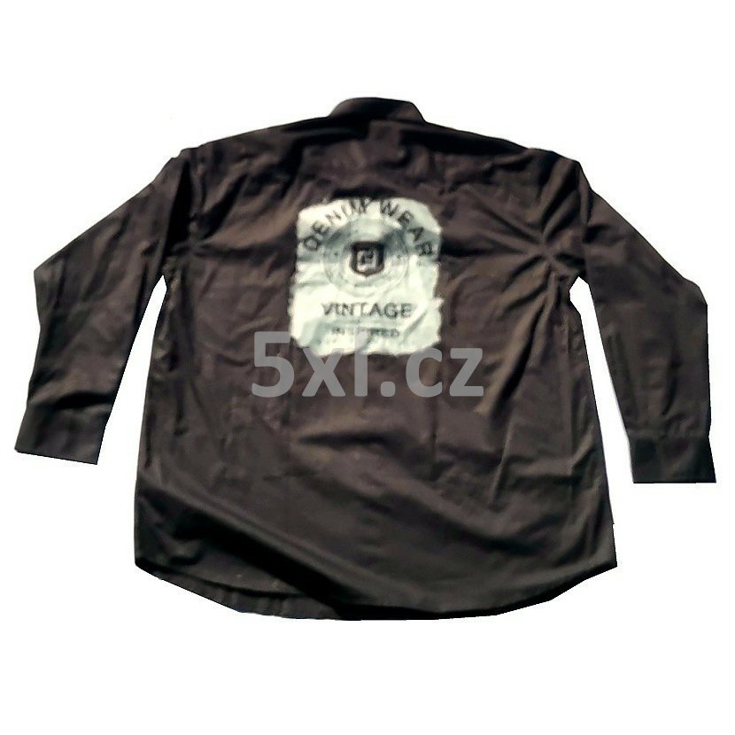 Pánská černá plátěná košile tdlouhý rukáv 3XL - 12XL v nadměrných velikostech. Zapínání na knoflíky. Levá náprsní kapsa na knoflík. Nad ní nášivka. Na zádech velký potisk.