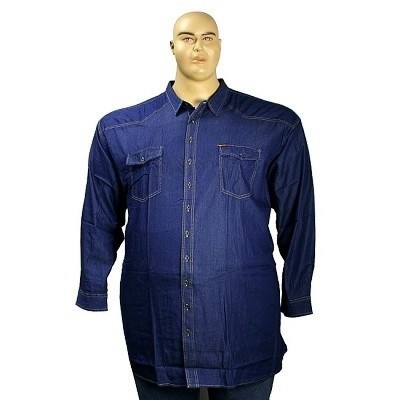 Pánská riflová košile JEANS Kamro 22756/263 tmavě modrá vel. 9XL -12XL dlouhý rukáv. Košile má zapínání na knoflíky. Rukáv ukončen manžetou se 2 knoflíky. Levá a pravá náprsní kapsa s klopou na knoflík.