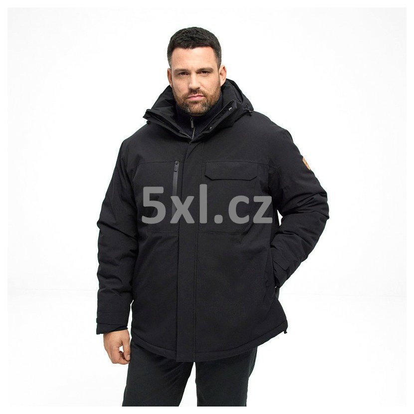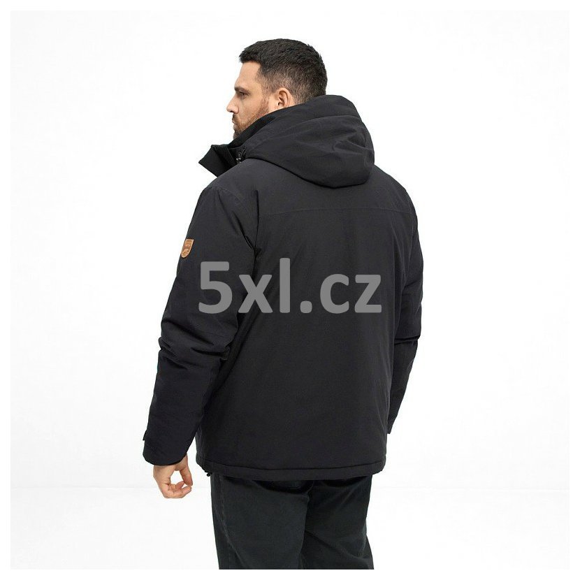 Pánská zimní bunda North 53154 černá s kapucí 5XL - 8XL vodní sloupec 5000 mm - nadměrná velikost. Odnímatelná kapuce. Zapínání na zip s klopou na druky. Levá a pravá kapsa na zip s klopou. Levá náprsní kapsa s klopou na druky, pravá náprsní kapsa na zip. Dvojitý rukáv - horní možno stáhnout pomocí pásku na suchý zip, vnitřní pružný úplet. Spodní část bundy ukončena gumičkou na stažení. Uvnitř levá náprsní kapsa na zip, pravá velká síťovaná kapsa.