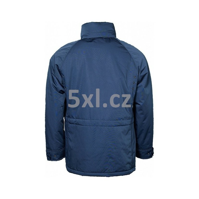 Pánská zimní bunda NORTH 56°4 tmavě modrá 6XL - 10XL vodní sloupec 3000nadměrná velikost. Zapínání na zip krytý klopou s druky. Pod tímto zapínáním ještě možnost dalšího zapnutí proti profouknutí. Límec stojáček. Přišitá kapuce, kterou je možno schovat do límce. Levá a pravá našitá kapsa s klopou na 2 druky. Rukávy ukončeny manžetou s 2 druky. V pase na stažení pomocí šňůrky. Uvnitř levá a pravá náprsní kapsa na zapnutí ( svislý zip ). Dole pravá našitá kapsa na druk. Raglanový rukáv.