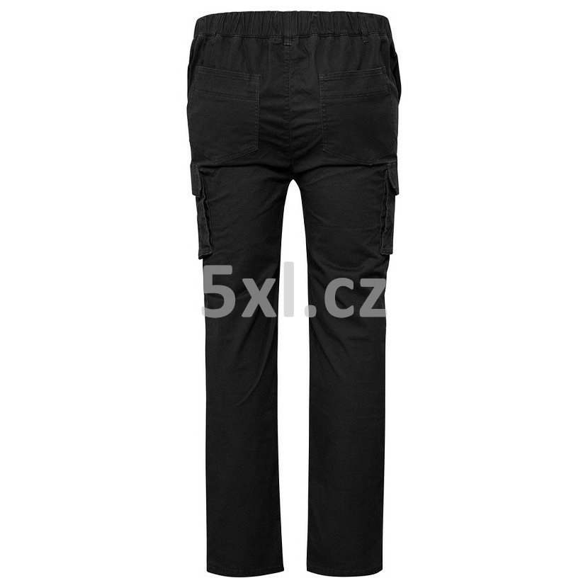 Nadměrné pánské kalhoty - kapsáče NORTH 53339 černé elastické stretch v nadměrných velikostech 4XL, 5XL, 6XL, 7XL, 8XL. Zapínání na zip a knoflík. Na bocích v pase částečně na gumu. Levá a pravá kapsa. Na obou nohavicích měchová kapsa s klopou na knoflík. Zadní levá a pravá kapsa.