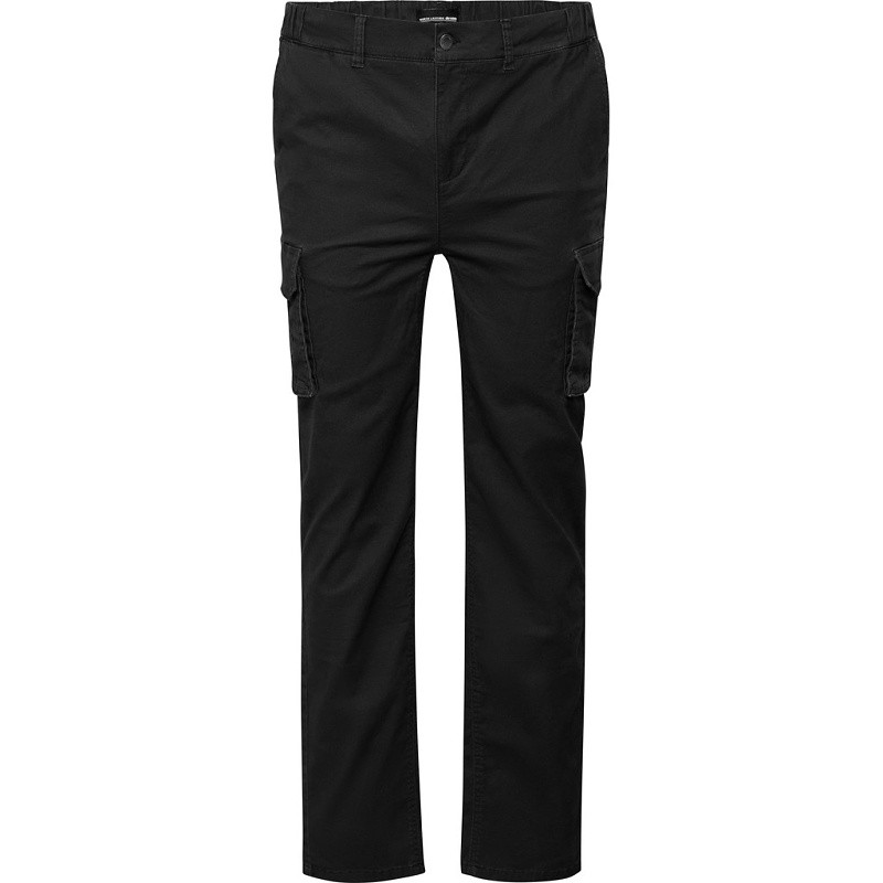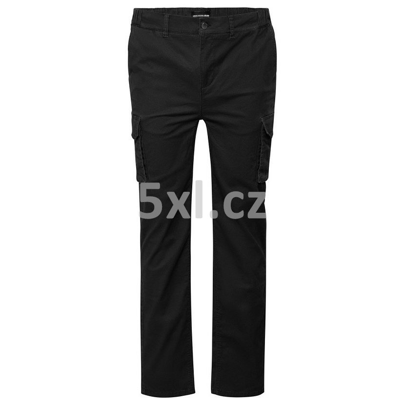 Kalhoty mají praktické rozmístění kapes – levá a pravá boční kapsa, zadní kapsy a prostorné měchové kapsy na obou nohavicích s klopou na knoflík, které poskytují dostatek místa pro osobní věci. Střih kalhot je navržen tak, aby zajišťoval pohodlí a volnost pohybu i mužům s mohutnější postavou, přičemž zachovává moderní a reprezentativní vzhled. Černá barva dodává kalhotám univerzálnost a snadno se kombinuje s tričky, svetry či košilemi, takže se hodí jak na volný čas, tak na práci či jiné aktivity.