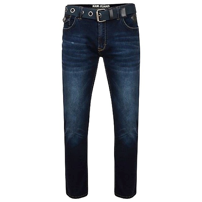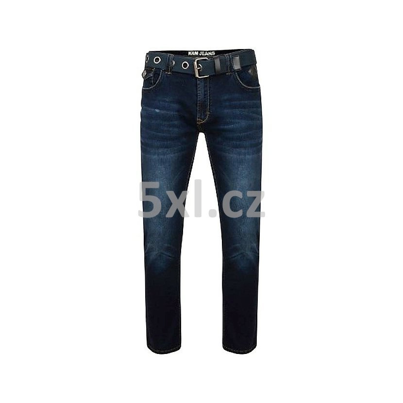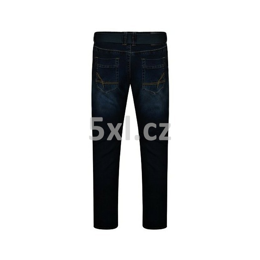 Pánské rifle tmavě modré elastické stretch s vybledlým efektem včetně pásku - nadměrná velikost. Zapínání na zip a knoflík. Levá a pravá kapsa, v pravé kapse malá kapsička na knoflík.