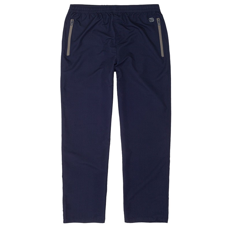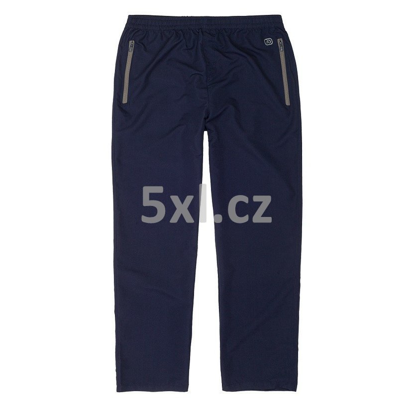 Pánské sportovní kalhoty ADAMO částečně nepromokavé tmavě modré - nadměrná velikost. V pase guma a šňůrka. Levá a pravá kapsa na zip. Zadní levá a pravá kapsa na suchý zip.