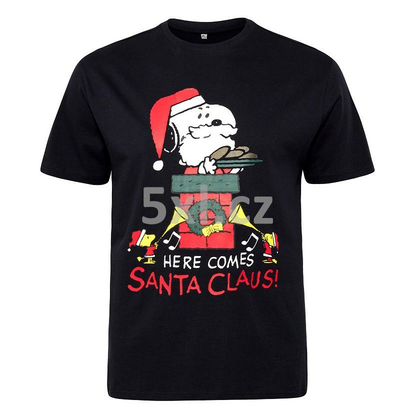 Dominantou trička je výrazný vánoční potisk Santa Clause, který přináší úsměv a radost. Motiv zachycuje Santovu postavu vystupující z komína, doplněnou nápisem “Here Comes Santa Claus!” v červenobílém kontrastu. Potisk je proveden v kvalitním tisku s dlouhou životností, odolný proti popraskání či blednutí. Na černém podkladu působí motiv živě a elegantně, čímž z trička dělá nejen sváteční, ale i stylový kousek.