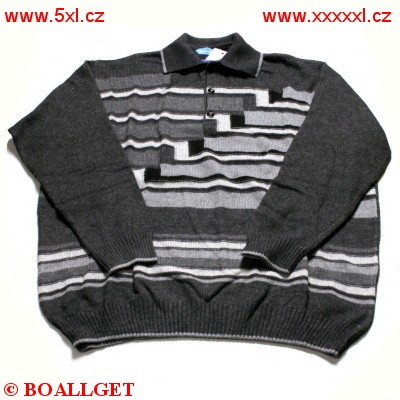 Pánský svetr přes hlavu s límečkem na tři knoflíky nadměrná velikost v barvě tmavě šedé. Rukávy a zadní díl tmavě šedé barvy, přední díl zdobený šedými pruhy.