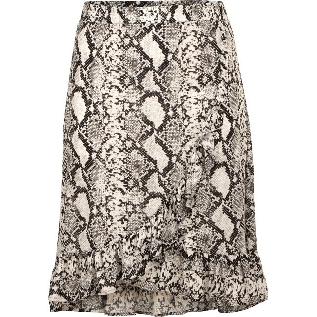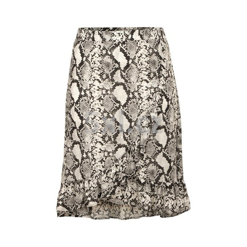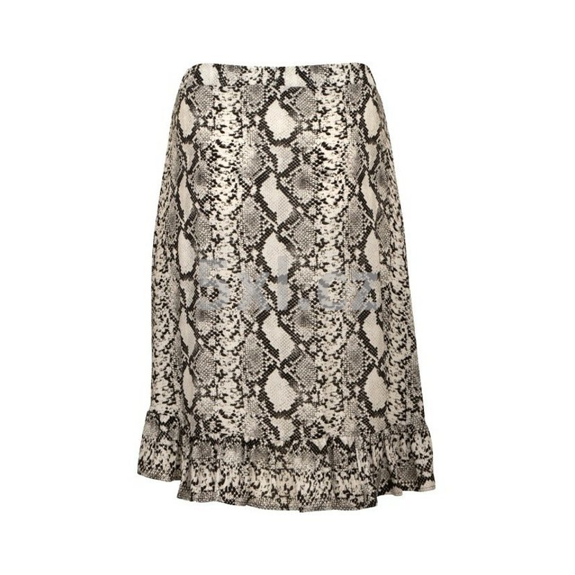 Sukně černo-bílá s potiskem - velikost 56 - nadměrná velikost. V pase guma. Dole 10cm široký volán, který vede vepředu přes střed šikmo nahoru. Zadní díl delší než přední. Tenká, lehká.
